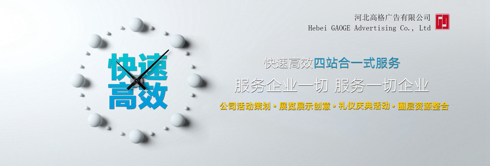 河北高格廣告有限公司是一家專業(yè)致力于大型文化活動組織策劃、展覽展示工程策劃、展臺設(shè)計制作、特裝展臺搭建、會議會場布置、巡回展覽、路演、公關(guān)推廣執(zhí)行、會議慶典禮儀、路演設(shè)備租賃、倉儲等一站式的專業(yè)服務(wù)公司。本公司憑借創(chuàng)新領(lǐng)先的服務(wù)理念,大型的廠房空間,現(xiàn)代化的機(jī)械設(shè)備,高素質(zhì)專業(yè)的服務(wù)團(tuán)隊,及在該行業(yè)多年的實(shí)戰(zhàn)經(jīng)驗(yàn),為地產(chǎn)營銷提供了優(yōu)秀的活動方案、為不同行業(yè)的數(shù)千家企業(yè)提供了專業(yè)個性化的空間展示方案,幫助客戶實(shí)現(xiàn)了自我品牌的提升和企業(yè)利潤的雙贏。...